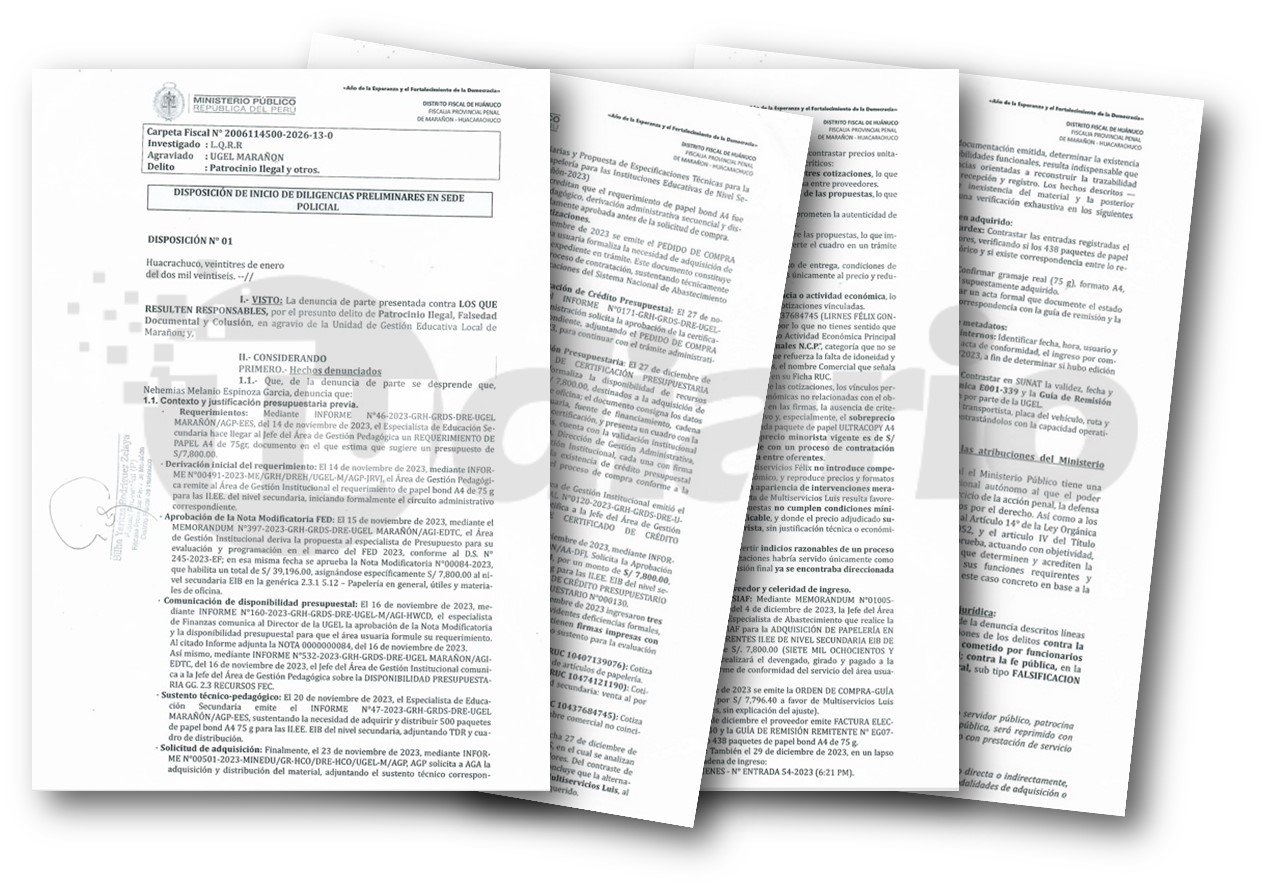 La Fiscalía Provincial Penal de Marañón dispuso el inicio de diligencias preliminares en sede policial contra funcionarios de la UGEL Marañón que resulten responsables por presuntos delitos contra la administración pública en el proceso de adquisición de papel bond, realizado en los últimos días de 2025. Según la denuncia, los bienes no habrían ingresado al almacén en la fecha correspondiente, sino posteriormente.