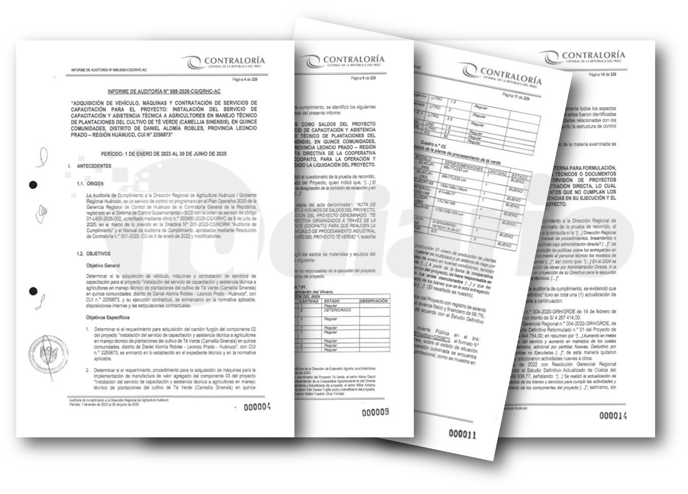 El Informe de Auditoría N° 988-2026-CG/GRHC-AC, publicado por la Contraloría General de la República, reveló graves irregularidades en el proyecto “Instalación del servicio de capacitación y asistencia técnica a agricultores en manejo técnico de plantaciones del cultivo de té verde en 15 comunidades del distrito de Daniel Alomía Robles, provincia de Leoncio Prado”, ejecutado entre el 23 de agosto de 2020 y el 31 de diciembre de 2024. Según el documento, las deficiencias ocasionaron pérdidas por 478,800 soles al Estado peruano.
