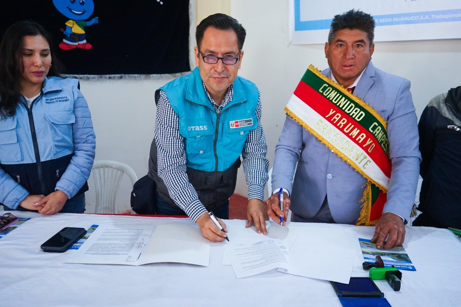 El gerente general de la EPS Seda Huánuco S.A. Ing. Mirko Jurado Dueñas y el presidente de la comunidad campesina del distrito de Yarumayo, Antonio Silva Bruno, firmaron un convenio para ejecutar el proyecto piloto: ‘Mecanismos de retribución por servicios eco sistémico hídrico (MRSE-H) en los sectores de San Pedro de Huequia y Quishuarhuachag, comprensión del distrito de Yarumayo, provincia y departamento de Huánuco.