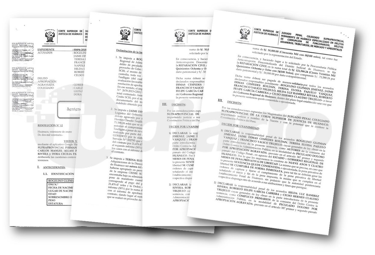 Rogelino Guzmán Jiménez, Jaime Céspedes Roldán, Teresa Pajuelo Vásquez, Francisco Yalico Trujillo, Hilda Ramírez Rivera, Roberto García Cabrera y Celso Claudio Trujillo fueron condenados a 9 años y 4 meses de pena privativa de libertad tras por el delito de peculado doloso en agravio del Gobierno Regional de Huánuco.