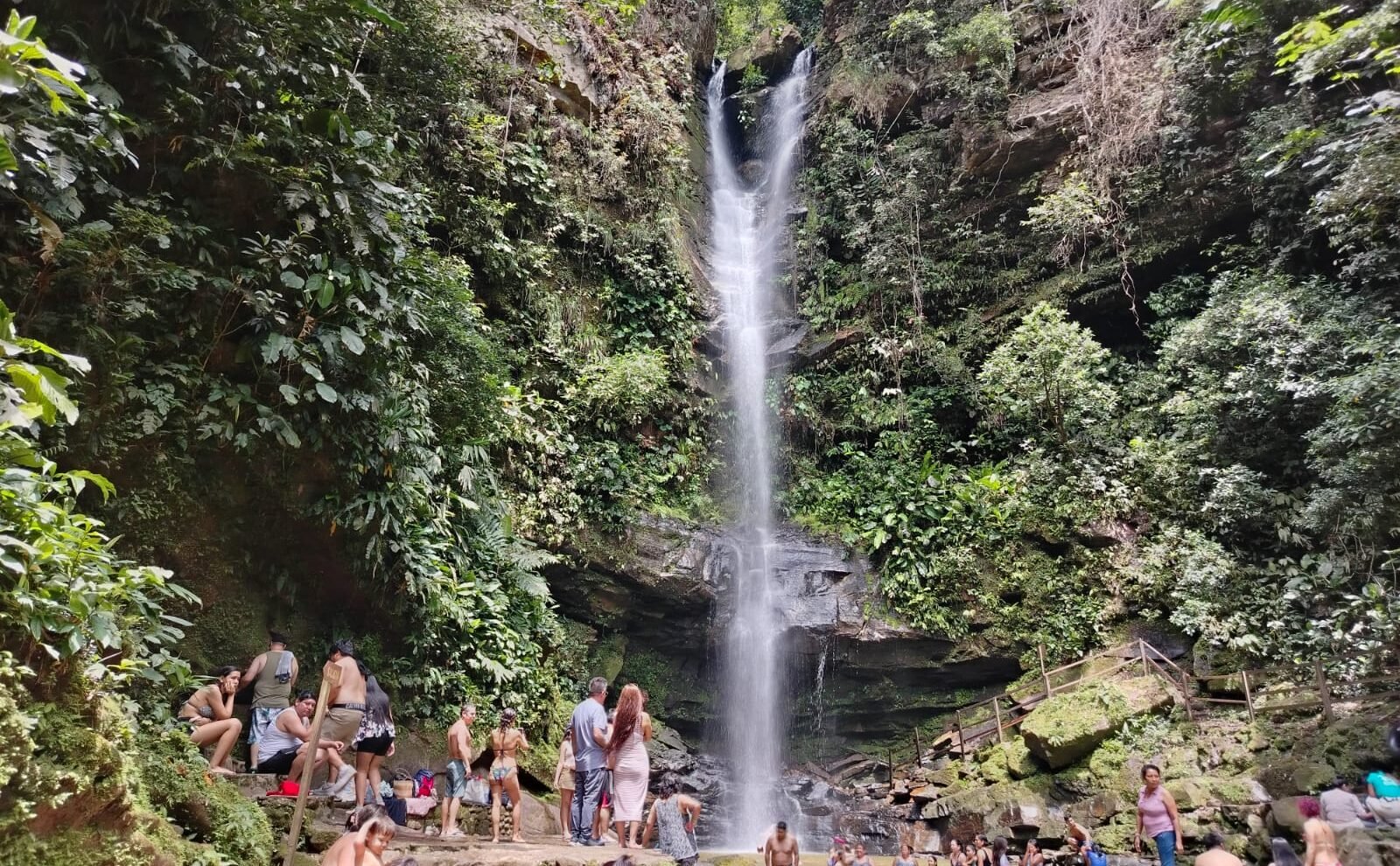 Muchas veces a toda caída de agua le llamamos catarata o cascada, pero aquí en Ahuashiyacu tenemos catarata. Exacto. A la espalda de nosotros tenemos una hermosa caída de agua delgada que se considera catarata. De veinte metros a más considérese como catarata.
